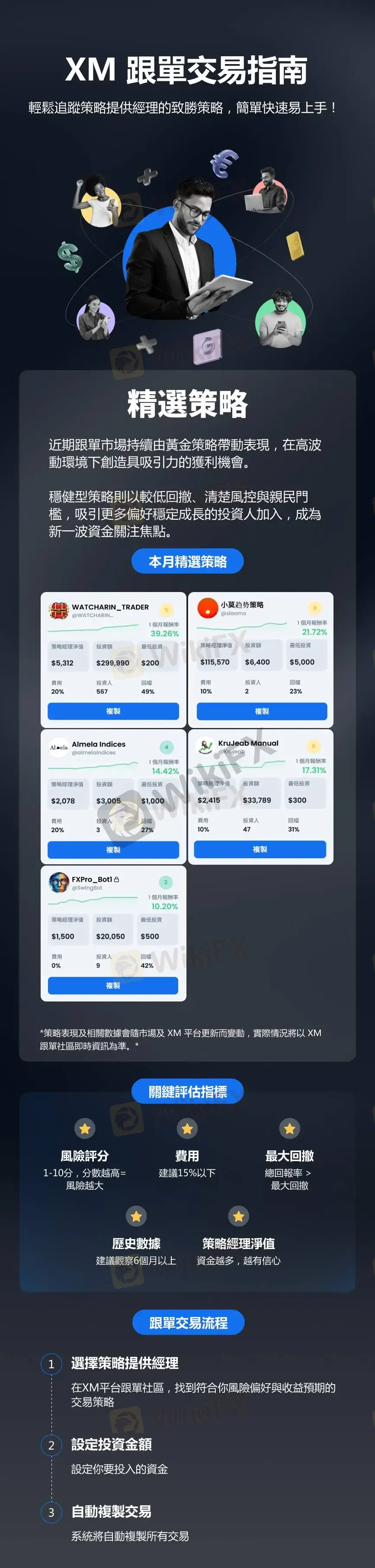在 XM 跟單社區 (Copy Trading) 中,你可以依照個人風險偏好與交易風格,選擇合適的交易策略自動操作——輕鬆跟單,掌握市場節奏!
